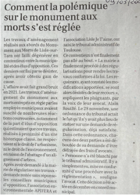 Le Tribunal Administratif de Toulouse a mis fin à la procédure juridique en cours sur la régularité de l’opération. Voici l’article publié pour clore l’affaire par le journal La Dépêche le 09 mars 2023 … C’est le point final de cette malheureuse polémique qui restera comme le témoignage d’une défaillance majeure de la vie Lisloise provoquée par la majorité municipale actuelle, à savoir l’impossibilité, malgré tous nos efforts, d’avoir un DIALOGUE CALME et SEREIN oh combien souhaitable en démocratie, entre les différentes parties.