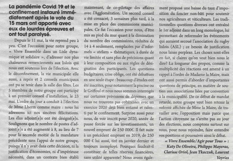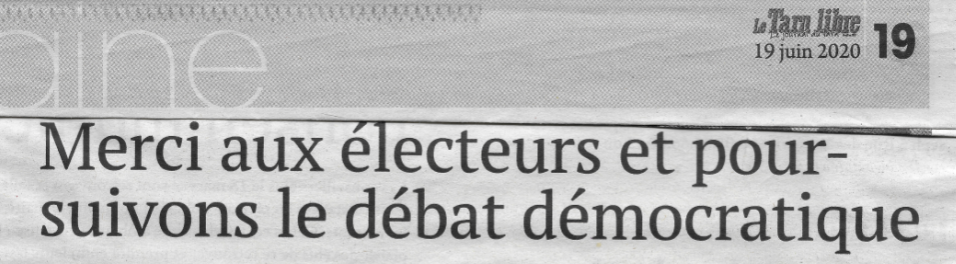 Suite a la reprise de l’activité depuis le 11 Mai, la vie des institutions MUNICIPALES a elle aussi redémarré et 2 conseils municipaux ont eu lieu. Vous trouverez ci joint le communiqué du groupe municipal d’opposition qui a été publié par le journal Le TARN LIBRE.