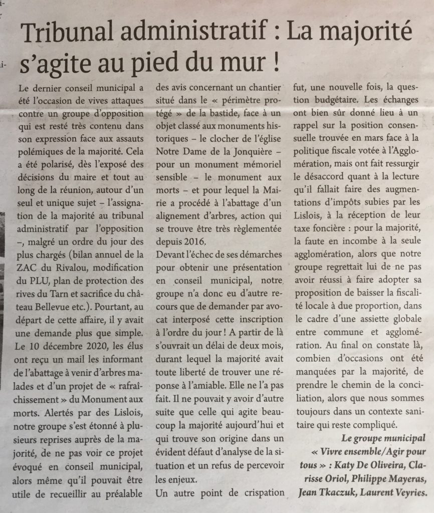 Jugement du TRIBUNAL ADMINISTRATIF de Toulouse relatif à l’opération de Rénovation du Monument aux morts de LISLE sur Tarn en 2020-2022